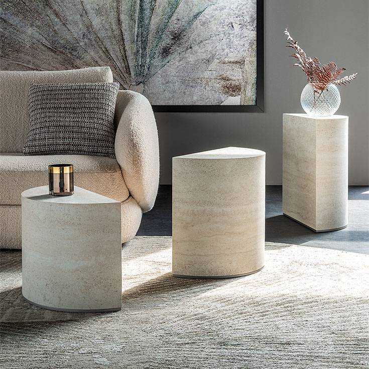 Cette table basse design haut de gamme puise son inspiration dans l’art métaphysique de De Chirico, évoquant les colonnes peintes par l’artiste italien dans ses atmosphères oniriques et mystérieuses. Disponible en trois hauteurs (35cm, 45cm et 55cm) pour un diamètre constant de 50cm, Domingo se décline en céramique Marmi Portoro mat, Borghini Calacatta mat ou Colosseo. En associant côte à côte ou en faisant pivoter des modules de différentes hauteurs, il est possible de révolutionner facilement votre salon design et créer des compositions dynamiques.