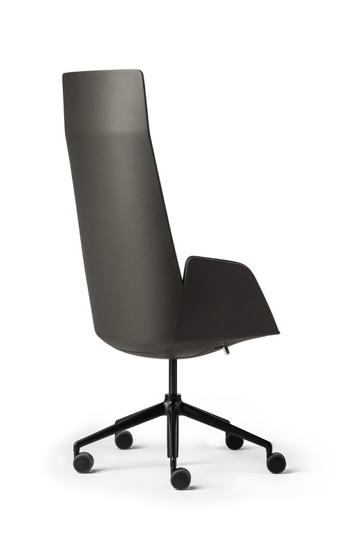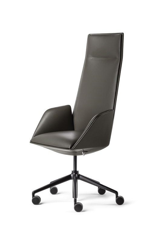 Son piètement en aluminium poli ou laqué noir repose sur cinq branches et intègre une colonne à ressort à gaz. Plusieurs versions d’accoudoirs sont disponibles, pour adapter le fauteuil aux besoins de chaque utilisateur. Le revêtement peut être entièrement en Pelle Frau® ou en combinaison cuir et tissu, permettant une personnalisation esthétique raffinée.