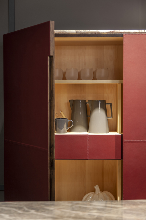 La structure en frêne massif et contreplaqué de bouleau, plaquée frêne moka à l’extérieur, contraste magistralement avec l’intérieur en érable naturel extra clair qui s’illumine à l’ouverture des portes grâce à un système LED intégré. Les côtés, portes et tiroirs intérieurs sont habillés de cuir précieux, tandis que la paroi arrière est recouverte de deux miroirs bronzés créant un jeu de reflets et de profondeur. Le plateau, disponible en frêne ou en marbre Arabescato Venato poli, ajoute une touche de sophistication minérale.