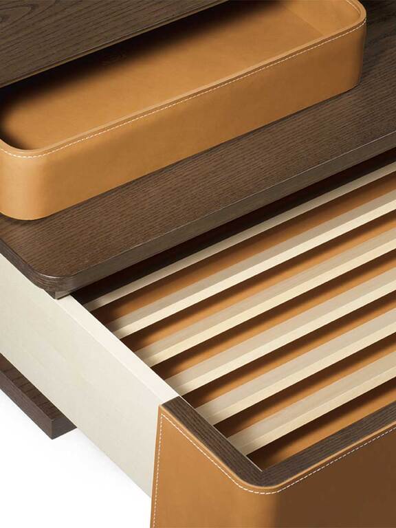 La structure en contreplaqué de bouleau et frêne massif, plaquée frêne teint moka, repose sur un piètement en tréteau au profil triangulaire qui accentue la légèreté visuelle de l’ensemble. Le large plateau supérieur comprend trois compartiments ouverts pour les équipements multimédias, tandis que la partie inférieure abrite trois grands tiroirs au design raffiné. Les façades de tiroirs entièrement recouvertes de cuir avec coutures contrastées révèlent à l’ouverture un intérieur lumineux en placage d’érable naturel extra clair.