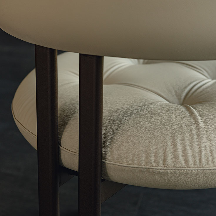 Le dossier flottant, formé d’un cylindre rembourré courbé, épouse la forme du dos et se prolonge naturellement jusqu’aux accoudoirs. Ce design enveloppant offre un confort exceptionnel tout en apportant une touche d’élégance sculpturale. La base, composée de trois pieds en tubes d’acier à section elliptique, confère stabilité et finesse à l’ensemble. Le pied central arrière, constitué de deux tiges rapprochées, renforce la structure tout en accentuant l’impression d’équilibre et de légèreté propre à la collection.