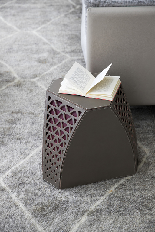 La structure tubulaire en métal finition canon de fusil accueille un plateau en tôle et multiplis de bouleau peint en noir, recouvert de cuir Cuoio Saddle Extra alternant panneaux massifs et perforés, avec des coutures contrastées et des détails artisanaux uniques. Hudson est conçue comme un double élément : la table principale encadre une seconde table-pouf, qui peut être utilisée séparément grâce à une poignée en cuir discrète, créant un jeu de volumes modulable et pratique.
