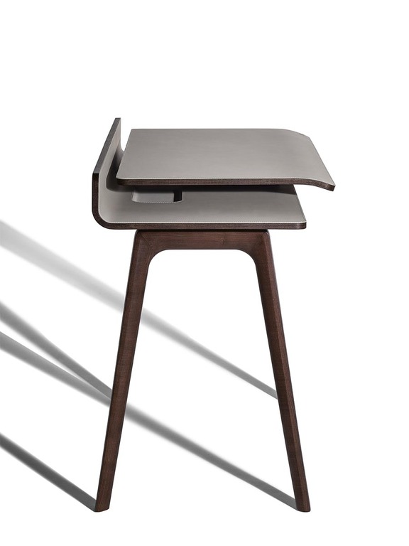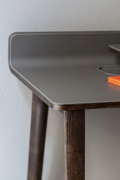 Cette version indépendante repose sur un piètement tréteau en frêne massif, combinant robustesse et légèreté visuelle. Son plateau coulissant, orienté à droite ou à gauche selon la configuration, permet de moduler l’espace de travail de 119 à 149 cm. La surface peut être revêtue de cuir Pelle Frau® ou de cuir sellier, agrémentée de coutures ton sur ton ou contrastées, selon le style souhaité.