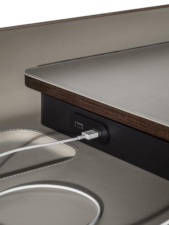 Chaque détail exprime l’excellence artisanale : le logo Poltrona Frau embossé, la finition raffinée du bois et la douceur du cuir. Une boîte métallique discrète intègre les ports USB et la recharge sans fil pour une utilisation pratique sans compromettre la pureté du design. Iren Freestanding incarne un bureau d’exception, à la fois minimaliste et chaleureux, idéal pour un espace de travail moderne et apaisé. Disponible chez D-Style Interior.