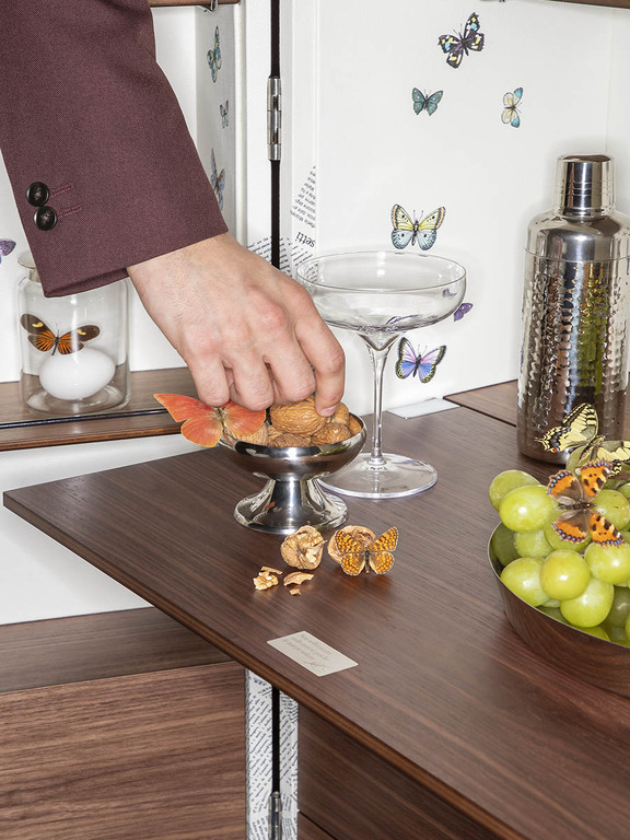 Inspiré par l’âge d’or des années 1920 et l’univers des voyages en paquebot, l’Isidoro Ultime Notizie évoque un monde de sophistication et de fêtes légendaires. Chaque détail témoigne d’un artisanat d’exception : de l’application méticuleuse du motif Fornasetti à la construction robuste en bois massif, en passant par les finitions métalliques raffinées. Ce meuble bar ne se contente pas de ranger – il raconte une histoire, transformant l’art du divertissement en expérience esthétique.