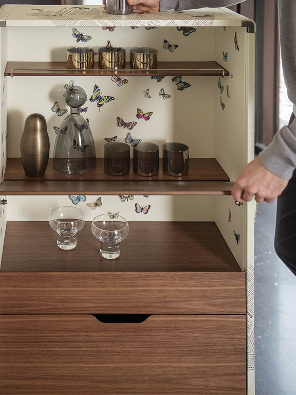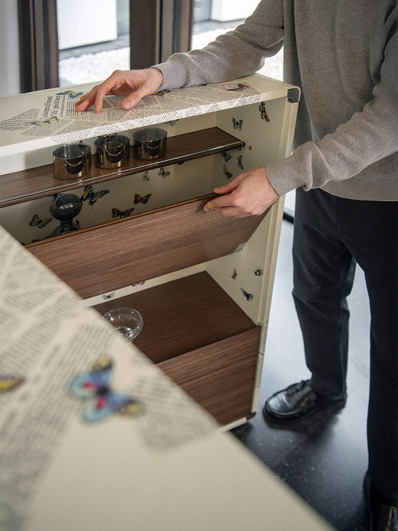 Entièrement fabriqué à la main en bois et revêtu du cuir d’exception Pelle Frau®, ce meuble bar design présente le motif emblématique « Ultime Notizie » (Dernières Nouvelles) créé par Piero Fornasetti en 1950 et réinterprété par son fils Barnaba. Ce trompe-l’œil ludique, où le cuir imite le papier journal, invite à une expérience visuelle unique et interactive. Les finitions raffinées en noyer contrastent élégamment avec l’intérieur entièrement gainé de cuir imprimé, abritant étagères, tiroirs et porte-bouteilles fonctionnels.