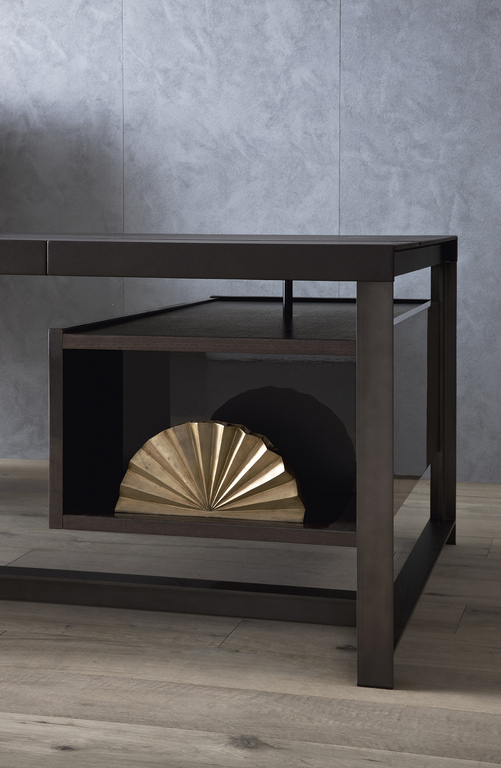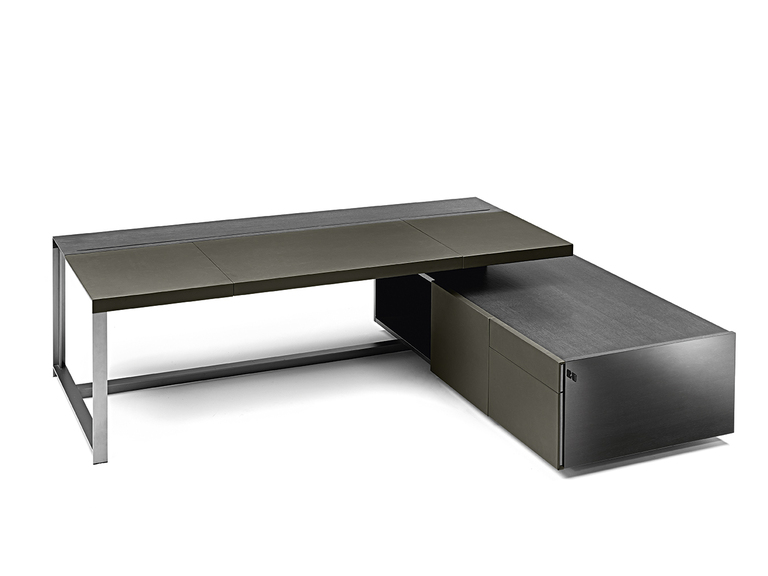 Disponible en plusieurs versions – President Desk, Executive Desk et Easy Desk – il s’adapte aux besoins de chaque environnement professionnel. Sa structure associe acier satiné couleur plomb et bois de rouvre teinté Plomb ou Tabac, tandis que le plateau est revêtu du célèbre cuir Pelle Frau®. Un tunnel passe-câbles relie élégamment le bureau à son meuble de rangement, garantissant un espace à la fois pratique et esthétique.