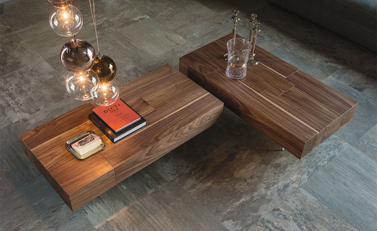 Le Lingotto par Cattelan Italia est une table basse design haut de gamme qui allie la grâce d’un design linéaire au grain sophistiqué du noyer Canaletto. Conçue par Paolo Cattelan en 2015, cette table basse en bois noble se distingue par ses planches qui s’assemblent comme un épais puzzle tridimensionnel, mettant en valeur les irrégularités naturelles du bois et créant un effet visuel d’une grande richesse.