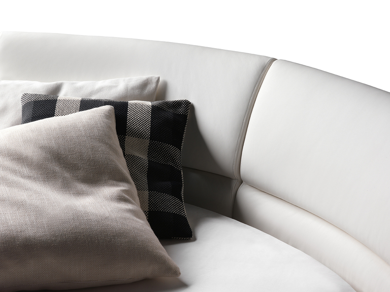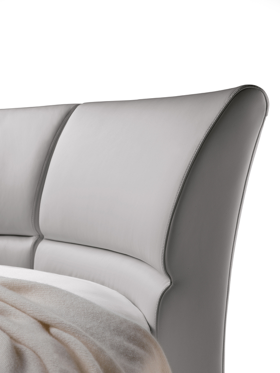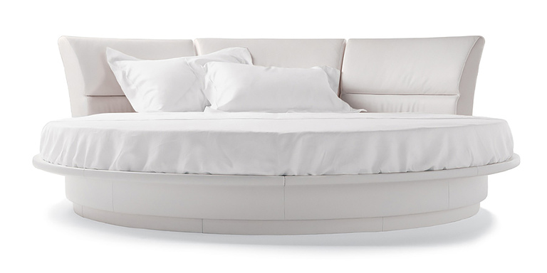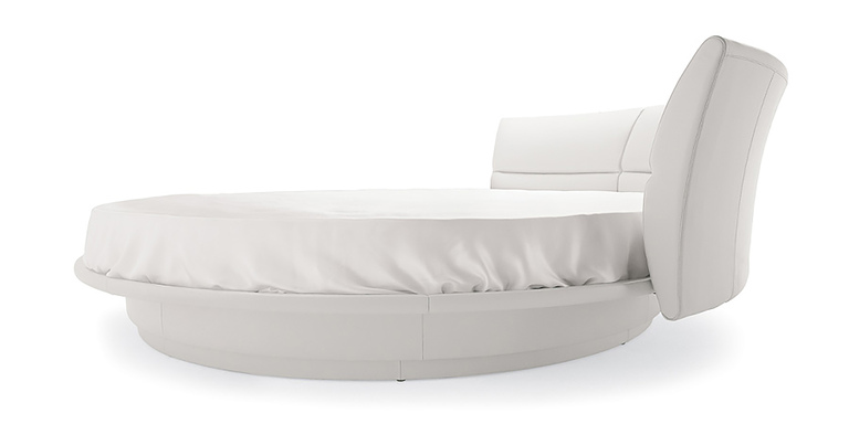 La tête de lit, rembourrée et enveloppante, repose sur une base circulaire en multiplis de peuplier, entièrement revêtue de mousse de polyuréthane et de cuir Pelle Frau®. Grâce à son mécanisme rotatif intégré, le lit peut tourner dans les deux sens, offrant une liberté d’agencement rare et une expérience unique d’utilisation.