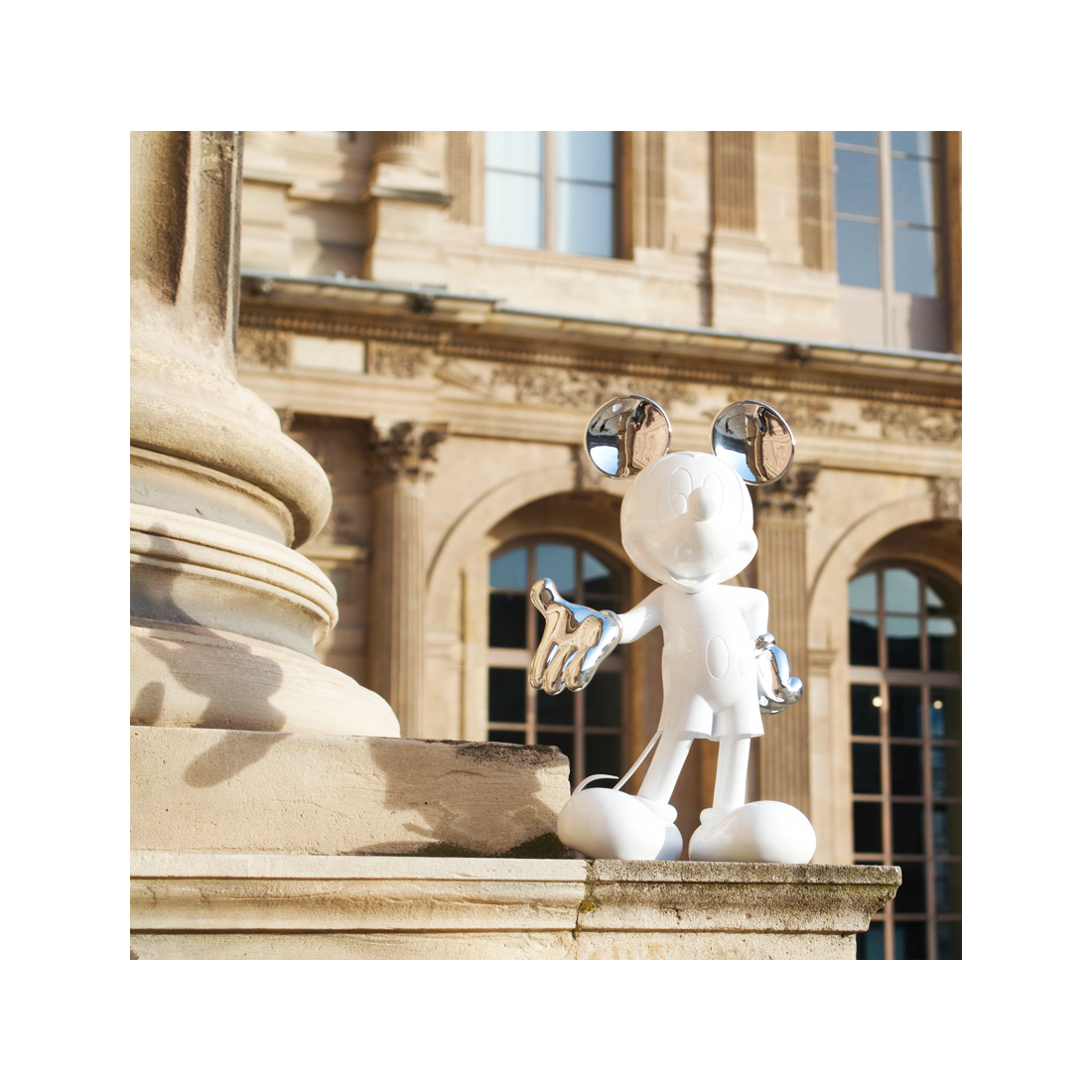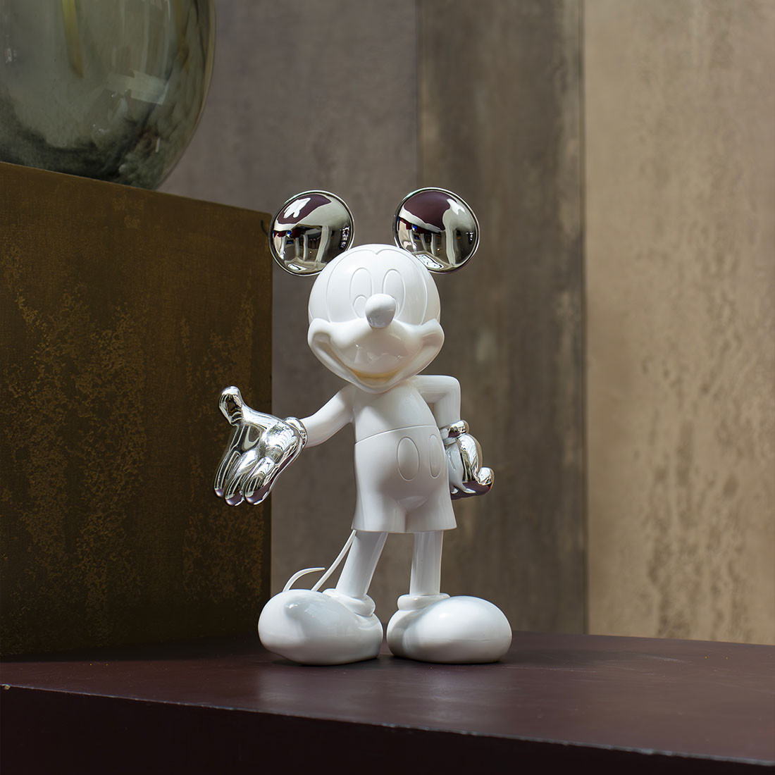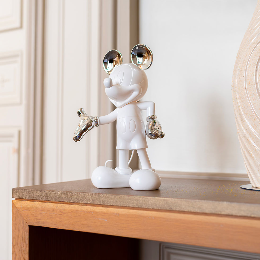 Cette sculpture design s’inscrit dans la collection Mickey Welcome de Leblon Delienne, réputée pour ses réinterprétations ultra-design des icônes Disney. La version bicolore, avec son contraste entre le fini mat et les éléments chromés, ajoute une dimension graphique et moderne au personnage emblématique. Chaque détail, de la posture accueillante aux finitions métallisées, a été pensé pour créer un objet à la fois familier et résolument actuel.