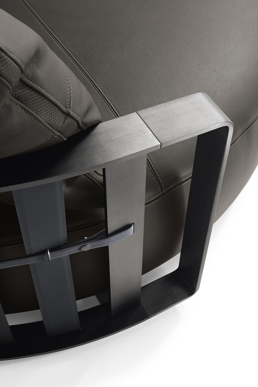 L’anneau d’acier bruni et brossé qui encercle le canapé supporte un ingénieux système de sangles en cuir créant à la fois accoudoir et dossier, abritant une assise rembourrée de plumes d’oie et de mousse de polyuréthane. Les huit roulettes unidirectionnelles permettent une rotation à 360°, offrant une flexibilité d’utilisation exceptionnelle. Les coussins de dossier, recouverts librement de coussins amovibles carrés et rectangulaires en tissu ou cuir Pelle Frau®, complètent cette expérience d’assise unique.