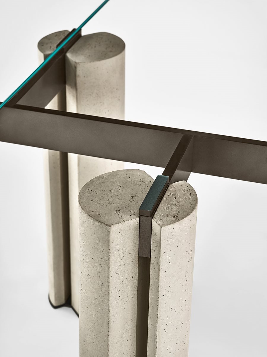 Gallotti&Radice Simpòdio System : table de salle à manger design en verre et bases béton allégé.
