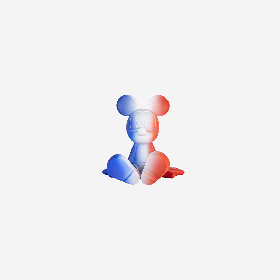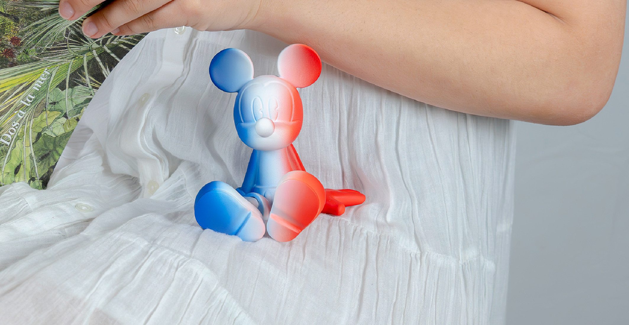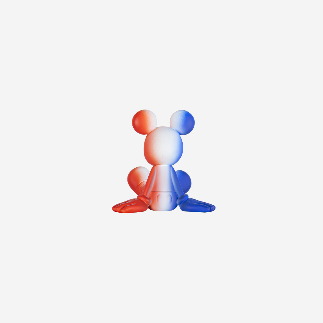 La sculpture met en scène Mickey Mouse assis, habillé dans une superbe tenue aux couleurs bleu, blanc et rouge, un clin d’œil élégant et poétique au drapeau français. Chaque dégradé de couleur est soigneusement appliqué à la main, révélant tout le savoir-faire artisanal de l’atelier Leblon Delienne. L’association des teintes crée un jeu de lumière subtil et harmonieux, donnant à la pièce une allure à la fois moderne et intemporelle.
