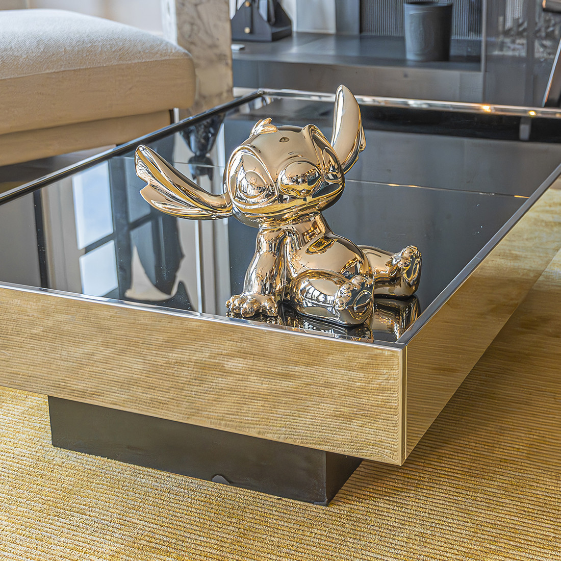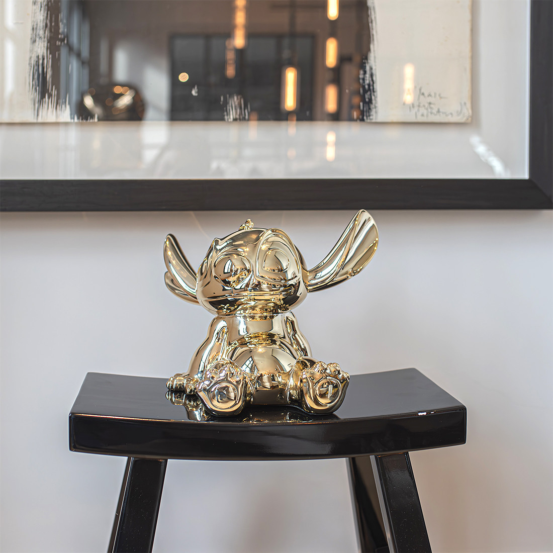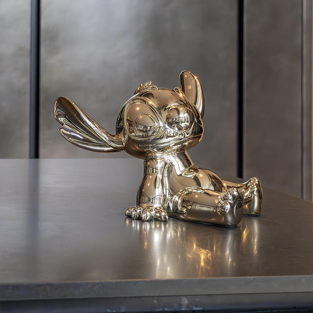 Connu pour son caractère unique et son énergie débordante, Stitch est ici représenté dans toute sa splendeur. Sa posture dynamique et ses détails minutieux reflètent parfaitement l’esprit ludique et attachant du personnage, tandis que la finition chromée apporte une touche contemporaine et sophistiquée, faisant de cette création un élément décoratif remarquable.