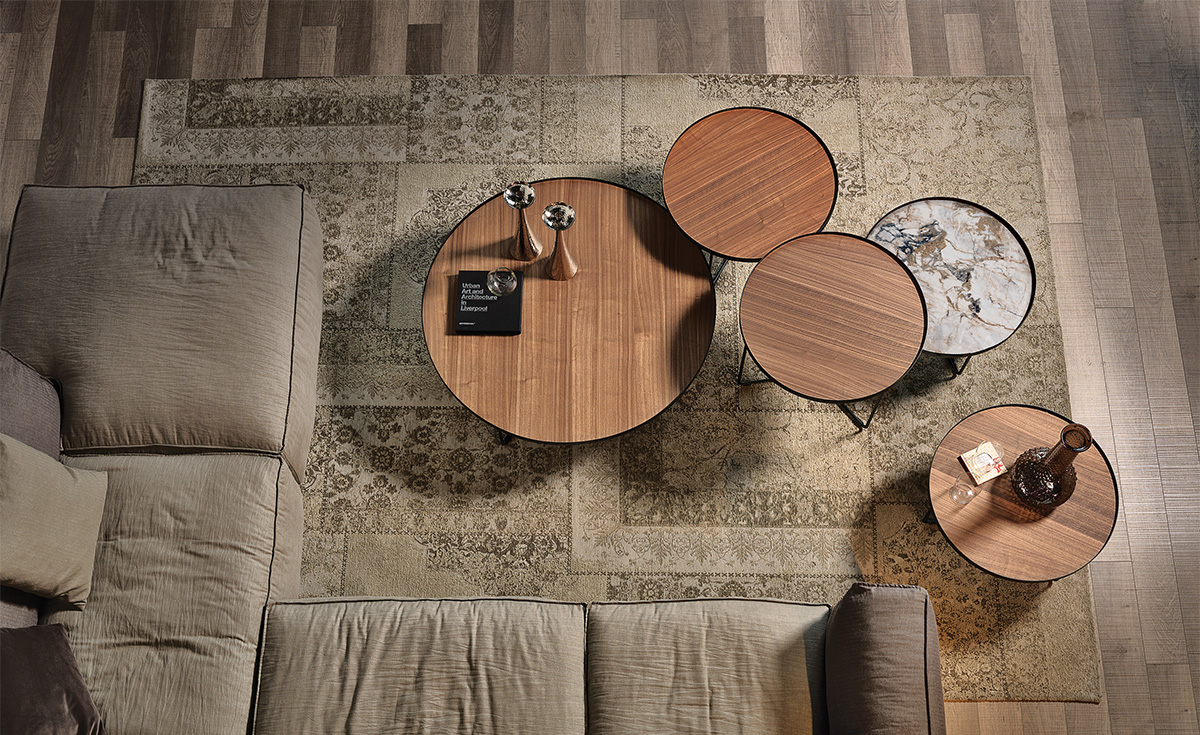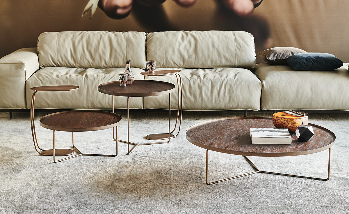 Cette table basse design haut de gamme se décline en différentes hauteurs (28cm, 38cm, 48cm) et diamètres (60cm et 100cm), permettant de créer un jeu de niveaux curieux et dynamique dans l’espace de vie. Le plateau est disponible en noyer Canaletto, chêne brûlé ou chêne naturel, tandis que la structure propose un choix de finitions métalliques exclusives : acier titane texturé, acier laqué noir ou bronze brossé. La finition Brushed, enregistrée comme design, est réalisée à la main et met en valeur les nuances précieuses du bois massif.