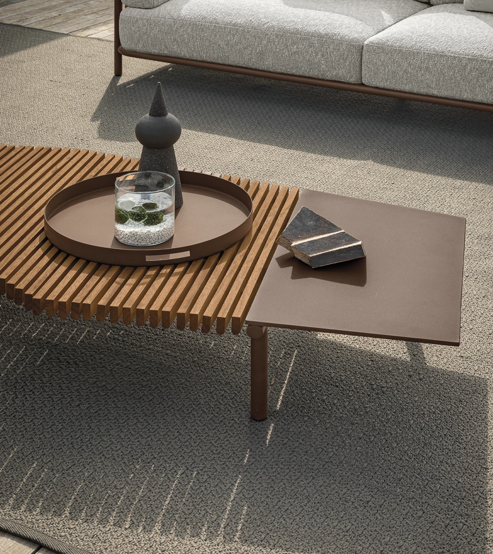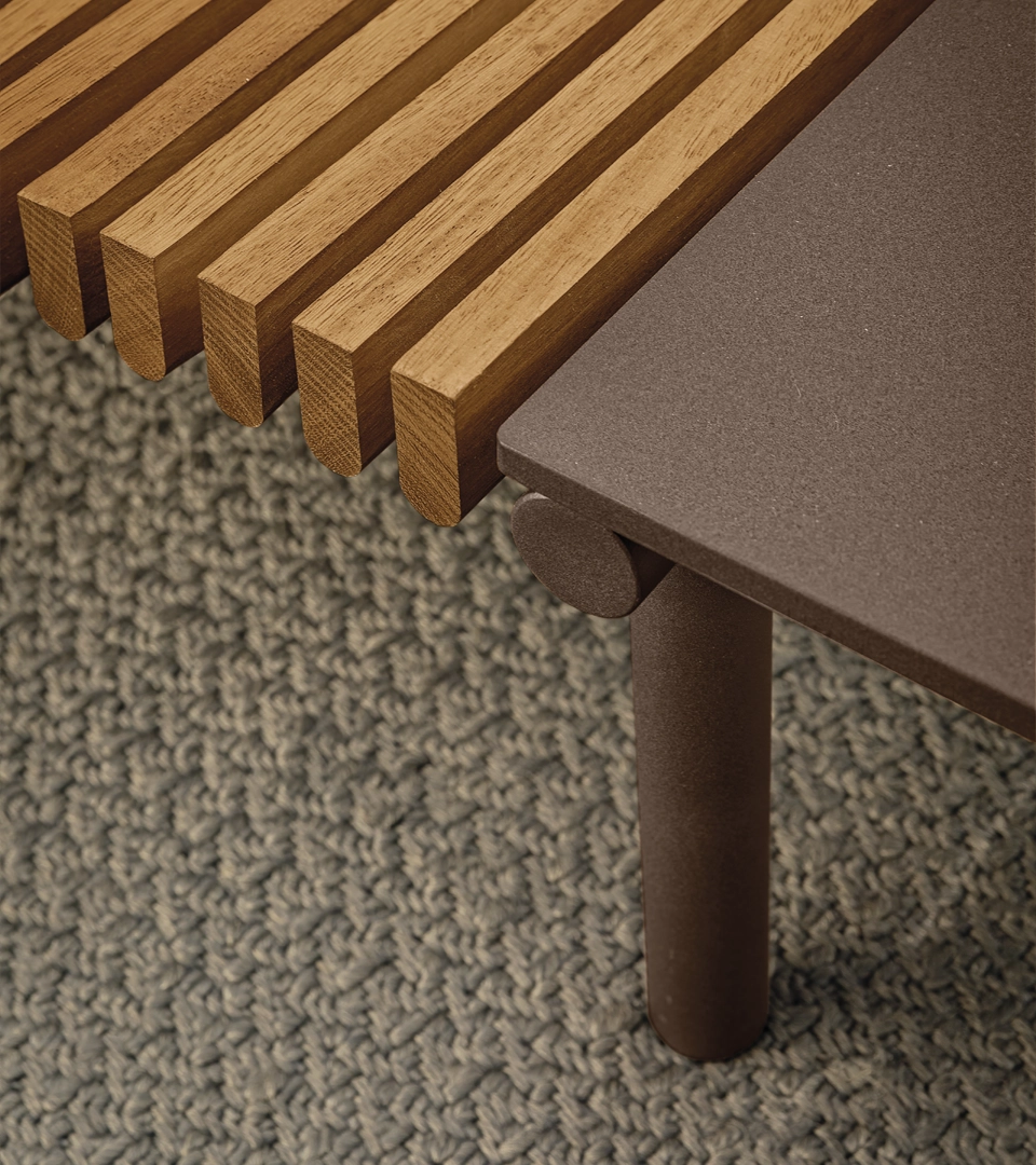 Son plateau, réalisé en bois massif, se distingue par des lignes rapprochées et des découpes solaires sublimées par deux finitions distinctes : l’acier inoxydable Corten et l’émail. Ces matériaux uniques apportent texture, profondeur et raffinement, donnant à la table un caractère artistique fort.