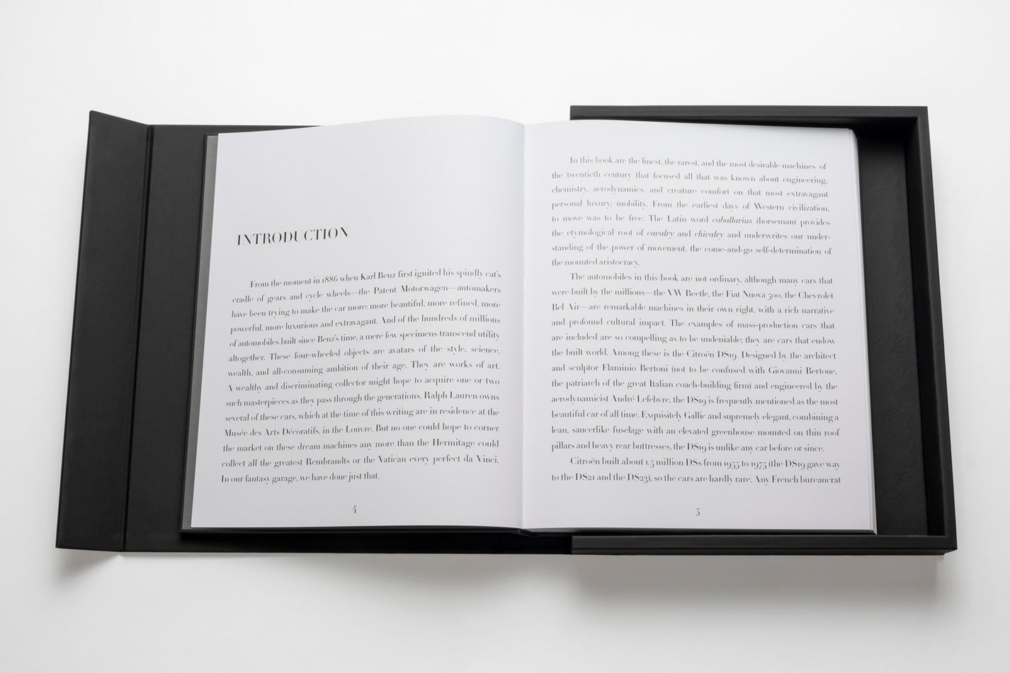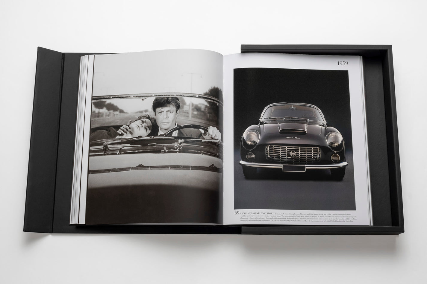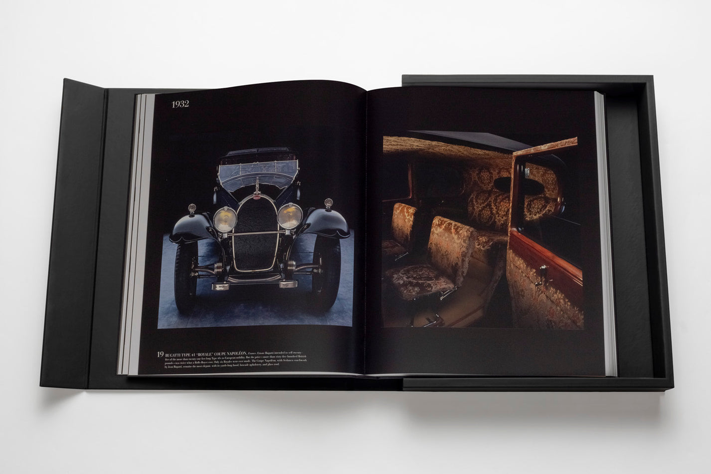 Ce livre design haut de gamme de la prestigieuse Ultimate Collection se présente dans un écrin élégant en caoutchouc noir avec plaque métallique, abritant un volume artisanal de 170 pages et 100 illustrations soigneusement sélectionnées. Les dimensions imposantes (39 x 47 cm) et le poids remarquable (11,34 kg) de cet ouvrage en font une pièce maîtresse qui s’impose avec caractère dans tout intérieur raffiné. La reliure artisanale traditionnelle et la qualité exceptionnelle des tirages couleur transforment chaque page en une célébration du design automobile.