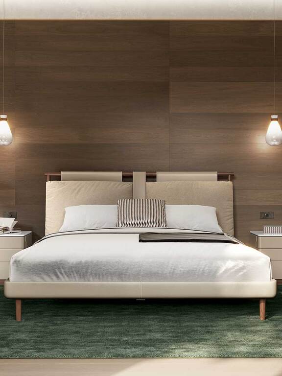 Le coussin de tête peut être personnalisé, avec des revêtements en cuir Pelle Frau® ou en tissu, permettant de renouveler l’aspect du lit selon vos envies et votre style. La structure, combinant frêne massif et peuplier multiplis, assure stabilité et durabilité. Un léger rembourrage en mousse de polyuréthane ajoute douceur et confort tout en respectant l’esthétique raffinée du lit.