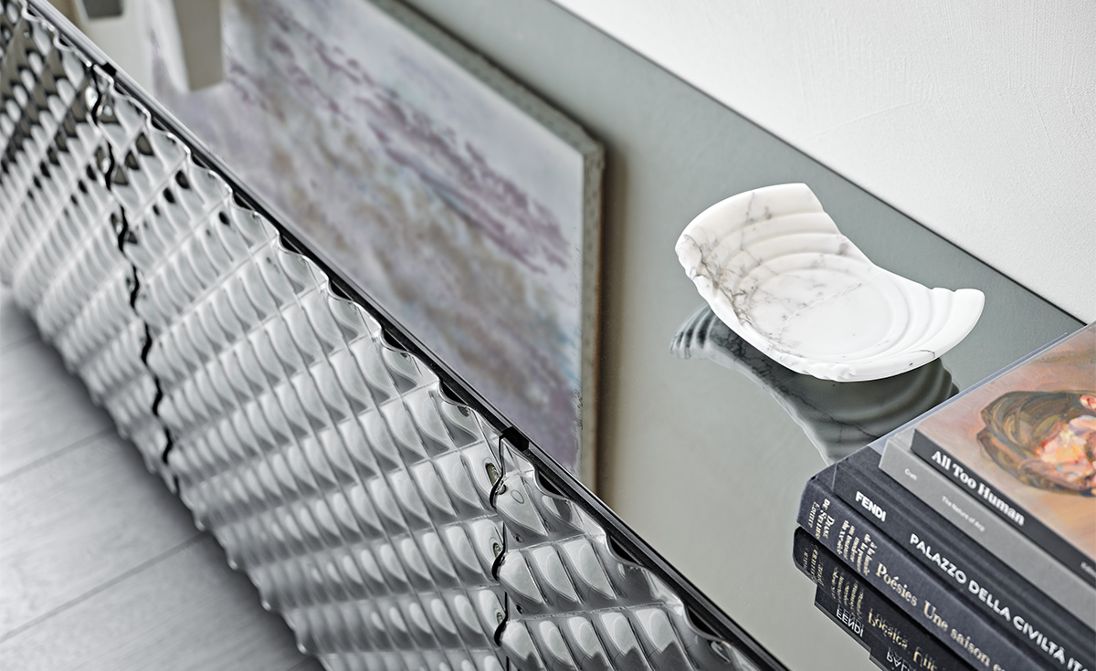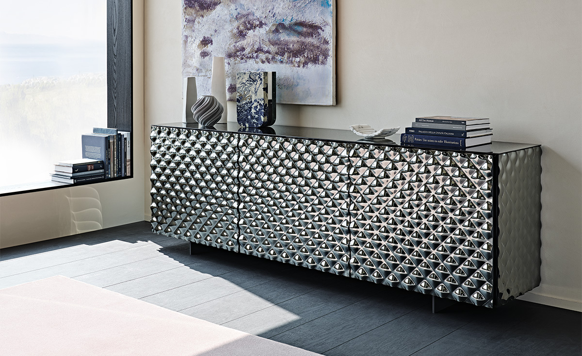Ce buffet design haut de gamme se décline en versions 2 ou 3 portes avec des dimensions allant de 150cm à 223cm de largeur et des hauteurs de 74cm ou 84cm. La finition avant est constituée de verre miroir couture fumé ou bronze matelassé, travaillé avec une technique inédite qui confère à la surface un effet tridimensionnel évoquant le matelassage sur tissu. Les profiles en aluminium laqué noir embossé et les pieds en acier inoxydable poli ou laqué graphite mat complètent cette composition raffinée.